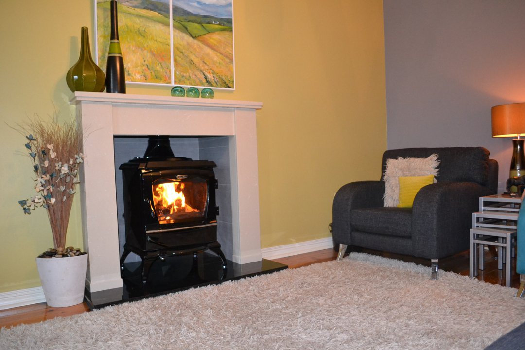 Double-sided stove - ideal for kitchen and living room combined, surrounded by hand-built McMonagle stone